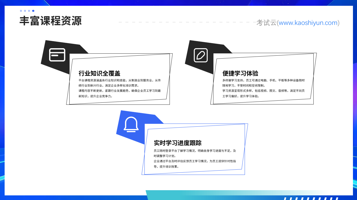 考试云是一个零成本快速搭建网络培训学院的平台,它集考试、练习、培训学习、证书于一体,可快速构建在线培训考试系统。通过考试云,企业可以轻松发布课程、设计课件、发布培训任务,并实时跟踪员工的学习进度和考试成绩。同时,考试云还支持多终端学习,员工可以通过PC、手机、Pad等终端设备随时随地进行学习,大大提高了学习的灵活性和便捷性。