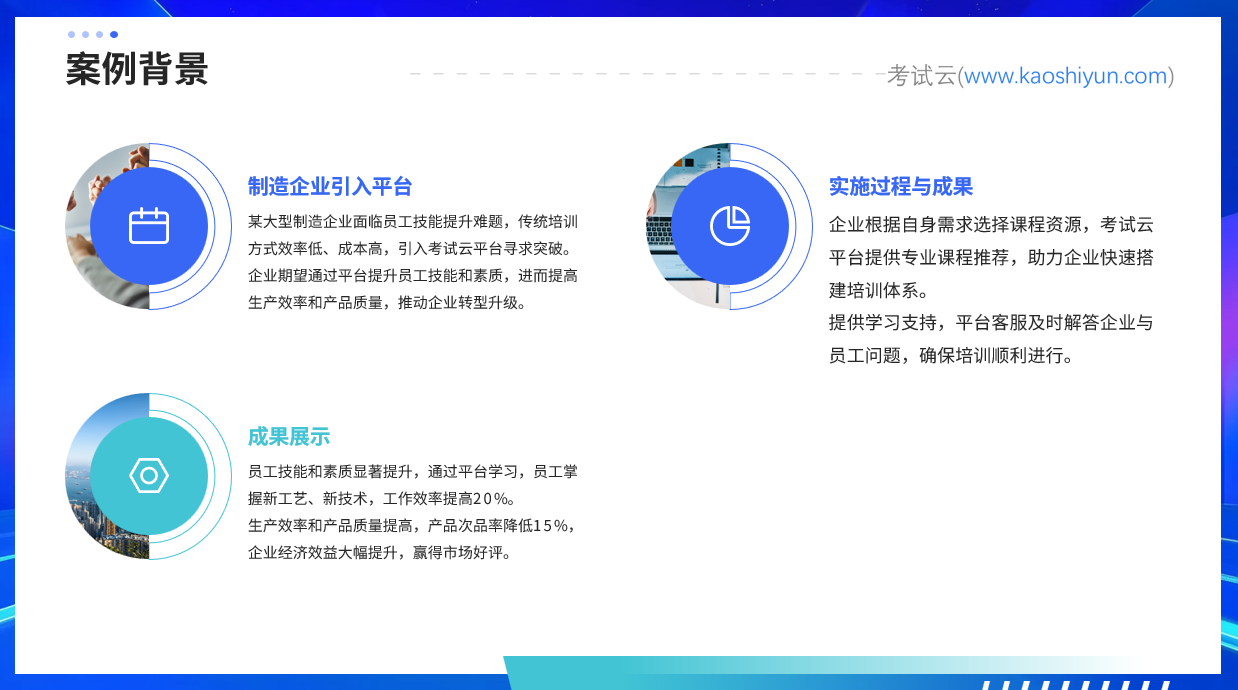 某大型制造企业为了更好地提升员工的技能和素质,决定引入考试云平台进行在线培训学习。通过平台上的课程资源和学习工具,企业为员工提供了全面、系统的培训课程和学习支持。同时,企业还通过平台上的实时跟踪和数据分析功能,及时了解员工的学习情况和进度表现。