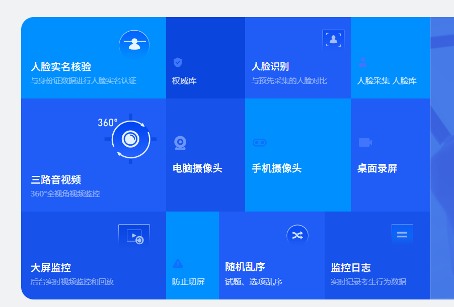 考试公平公正是认证考试的生命线,考试云深知这一点,因此在防作弊方面下足了功夫,采用了人脸实名+三路音视频监控全程录像的智能防作弊技术,为考试的公平公正保驾护航。