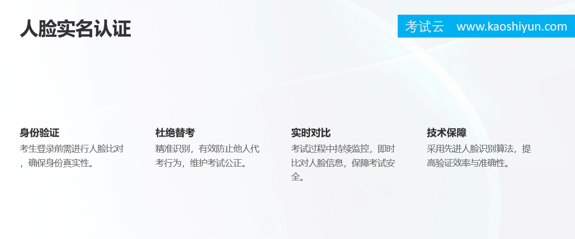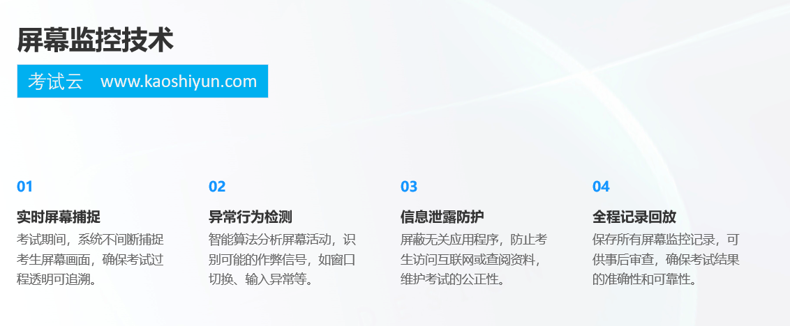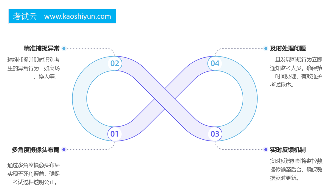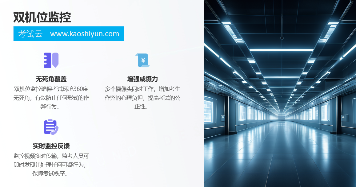 在线考试虽然具有便捷高效的优势,但同时也面临着监考困难、作弊风险高等问题。考试云平台深知公平是考试的生命线,因此引入了全方位防作弊监控系统,涵盖人脸识别、摄像头监控、屏幕监控、双机位监控及三路音视频监控等多种技术手段,全面保障考试过程的真实性与严肃性。