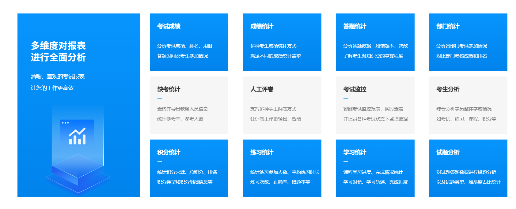 在大数据时代,考试不仅是评价学生能力的手段,更是反映教学质量、行业趋势的重要依据。考试云平台内置智能数据分析引擎,能够对考试数据进行多维度挖掘与可视化呈现,为教育管理者、企业HR和政策制定者提供决策参考。
