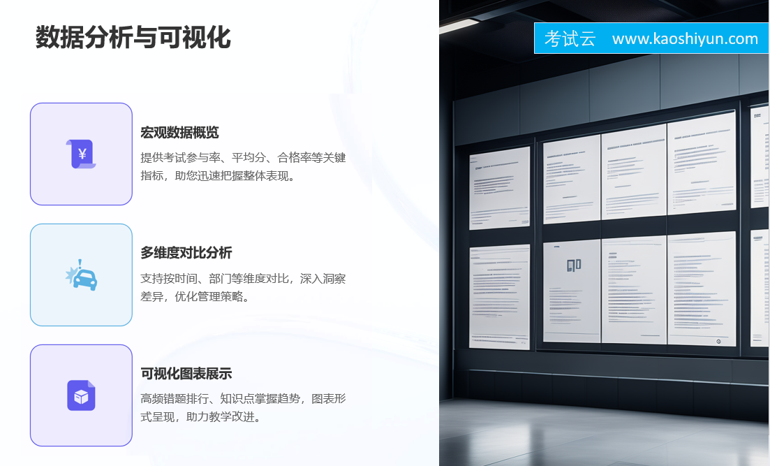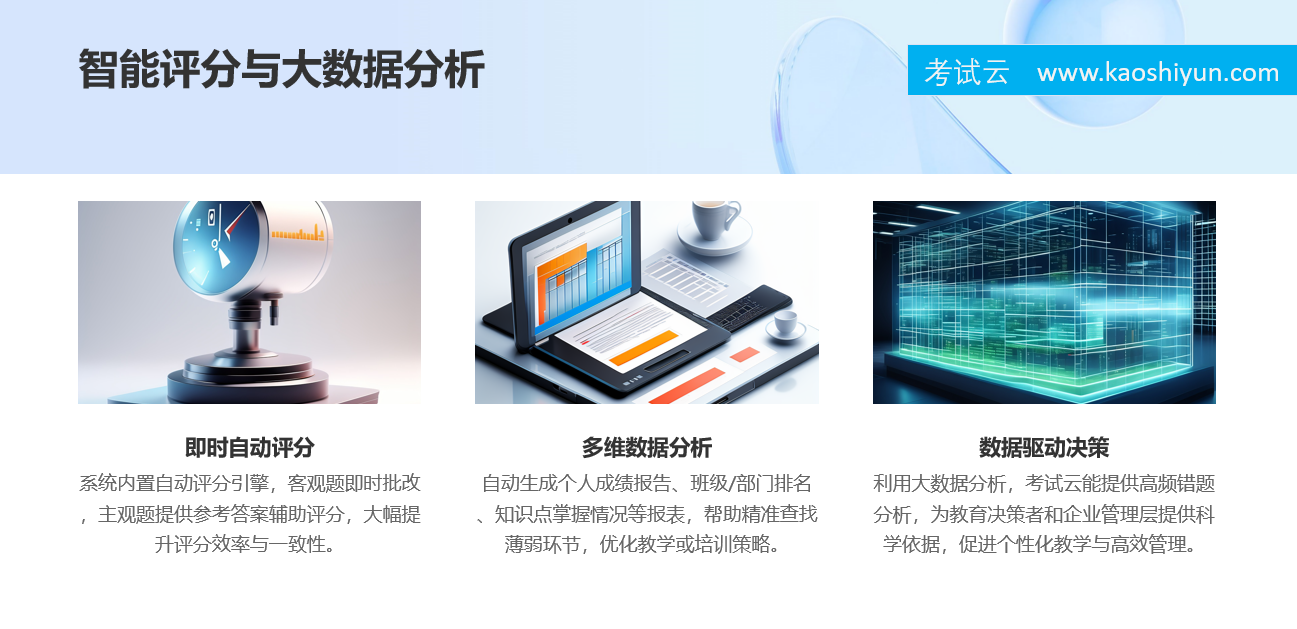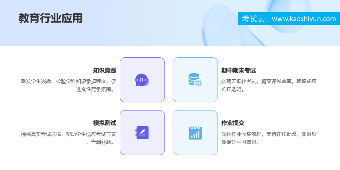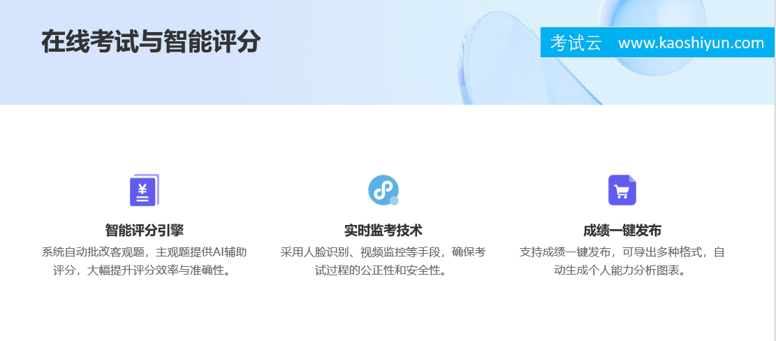随着人工智能、云计算、大数据等技术的快速发展,在线考试系统已不再是简单的“电子化答题”,而是成为推动教育公平、促进人才培养、提升组织效率的重要工具。考试云在线考试系统凭借其强大的功能体系、稳定的系统性能、灵活的部署方案以及丰富的行业经验,正在成为越来越多客户信赖的选择。