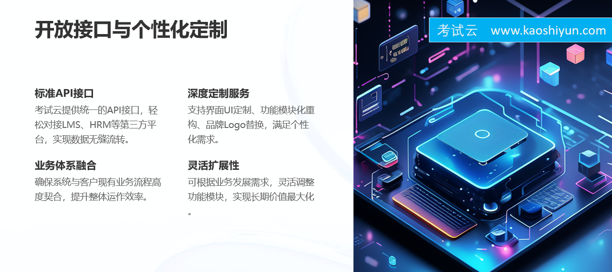 考试云提供标准API接口,支持与各类学习管理系统(LMS)、人力资源管理系统(HRM)、企业门户等第三方平台无缝对接。同时,也支持根据客户需求进行界面UI定制、功能模块化重构、品牌Logo替换等深度定制服务,确保系统与客户现有业务体系高度融合。