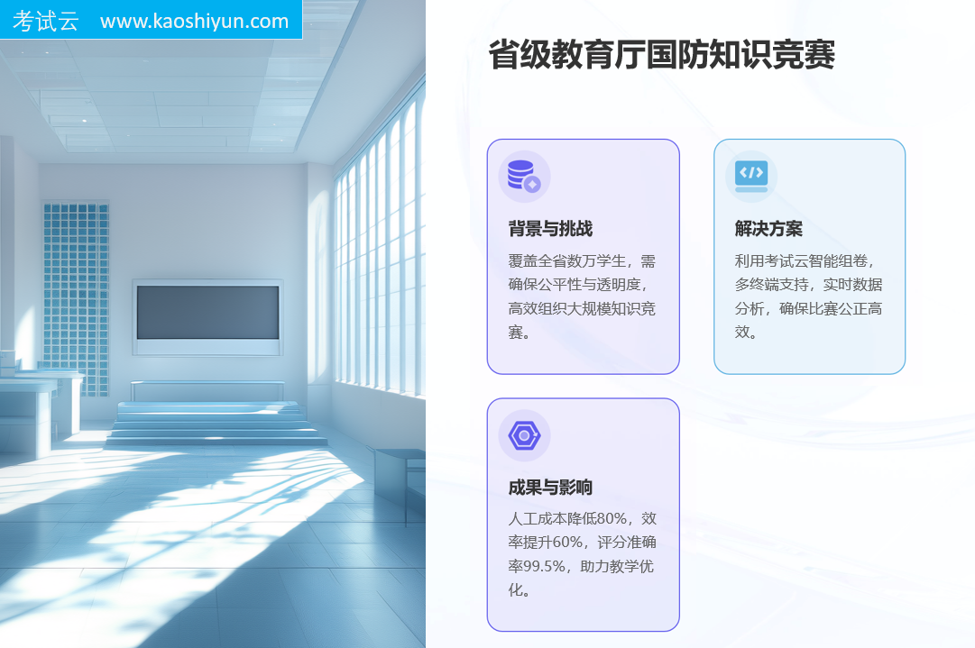 通过采用考试云-在线考试系统,该省教育厅成功解决了上述难题,并为全省在校生提供了一个公平竞争的平台。