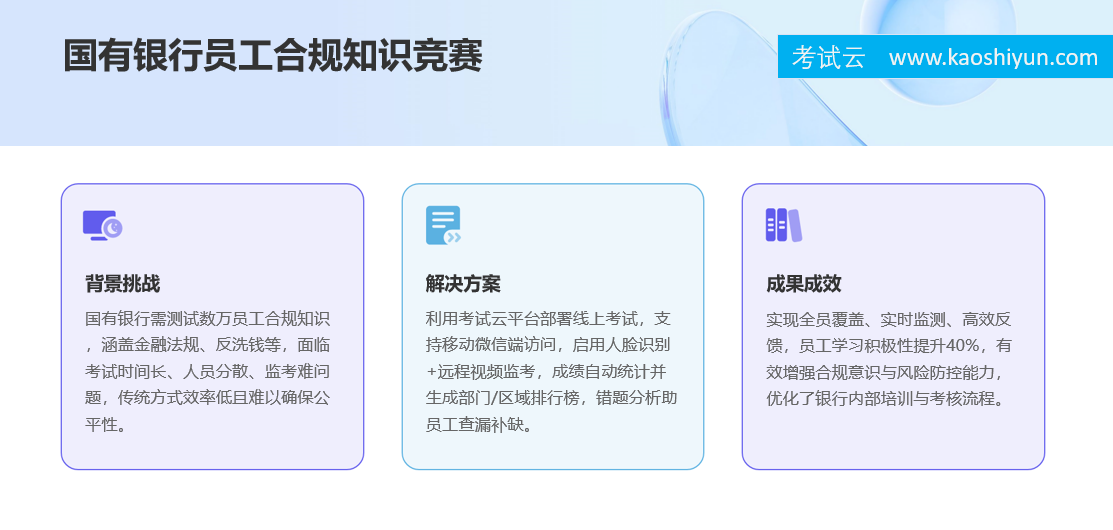 背景:该银行每年组织全行数万名员工参与合规知识测试,内容涵盖金融法规、反洗钱、消费者权益保护等。