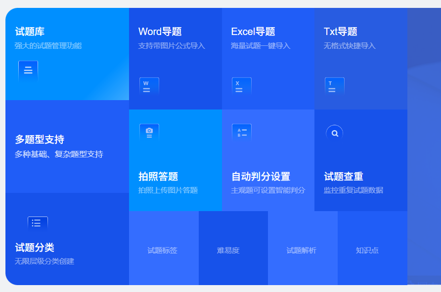 1、支持单选题、多选题、判断题、填空题、简答题等多种题型;