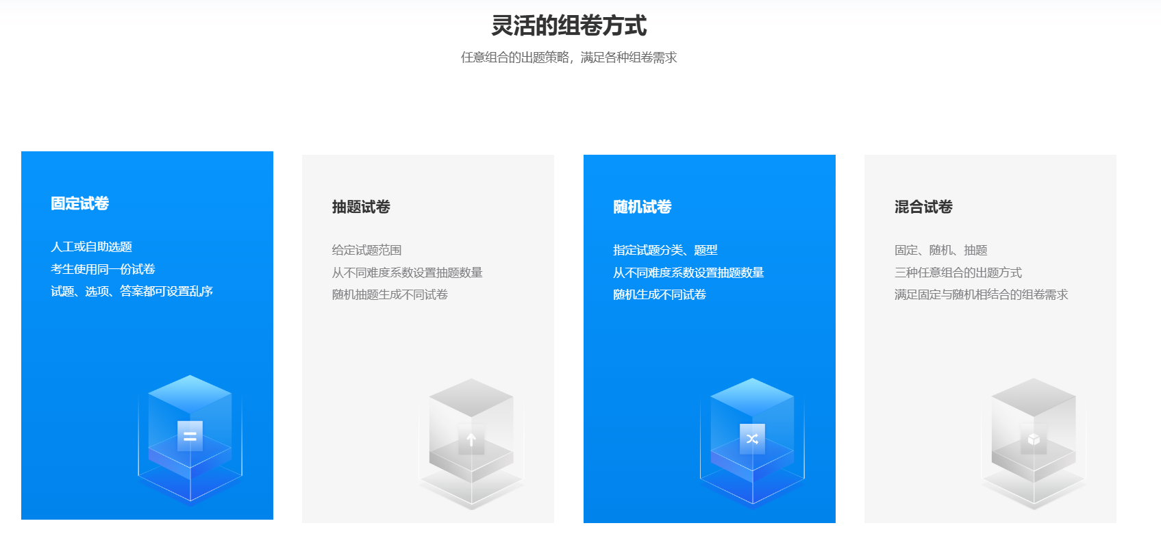考试云提供固定试卷、随机试卷、抽题试卷、混合试卷四种组卷模式,灵活适配不同考试目标与场景需求。