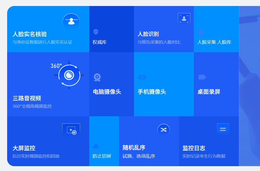 三路音视频监考:可同时采集考生正面、侧面及环境声音,全程录像记录考试行为;