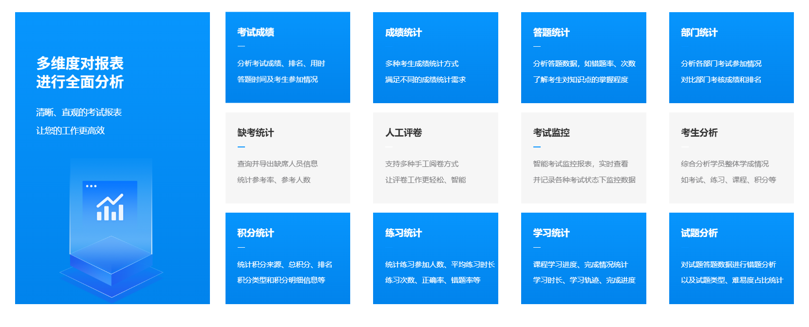 考后成绩需手动录入Excel或纸质登记,不仅耗时费力,还容易出现错漏。更关键的是,缺乏对答题情况、知识点掌握、错误率等维度的深度分析,无法为后续教学或培训提供有力支持。