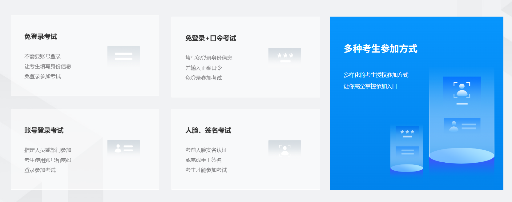 为满足不同组织需求,考试云提供四种考生参加方式:
