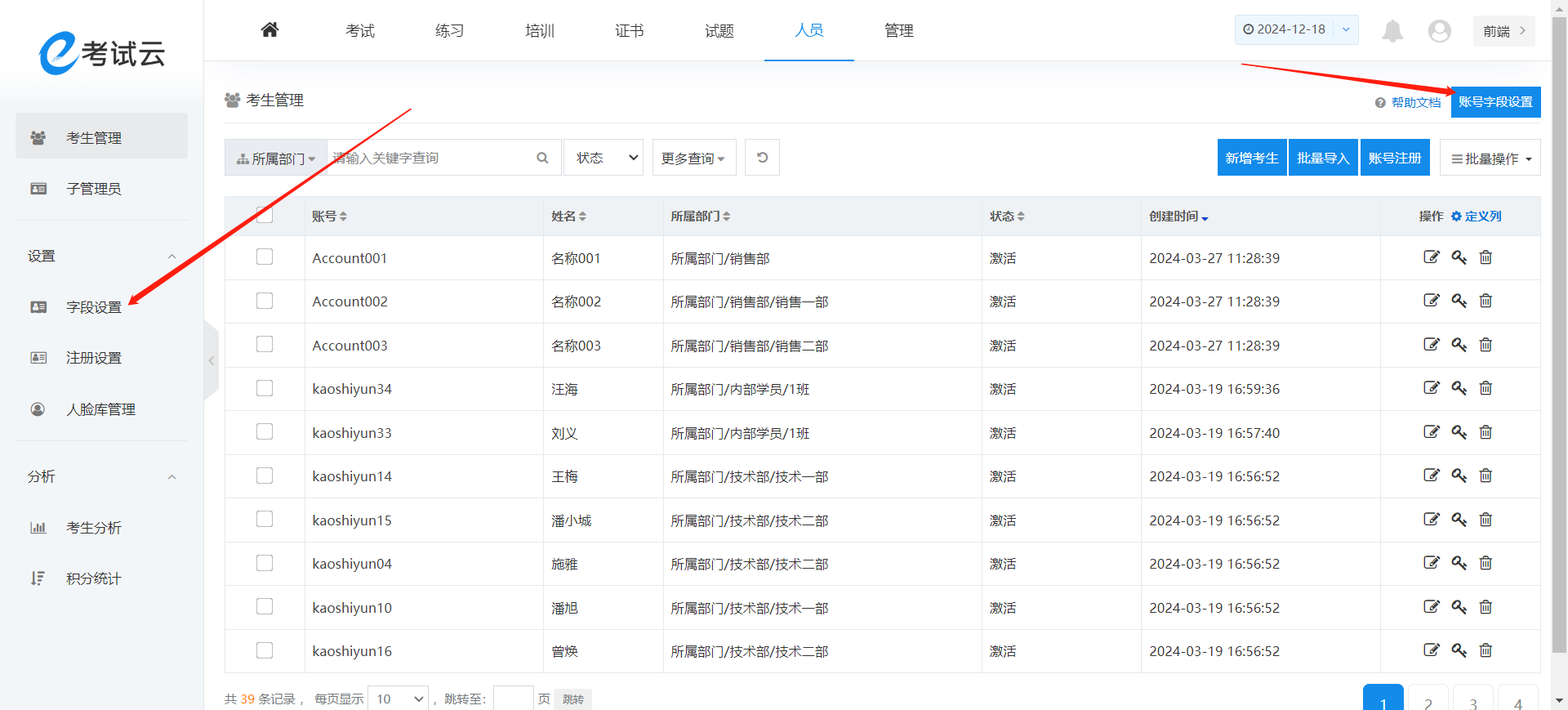 考生账号字段设置:指在考生管理中,可自定义设置需要显示的字段信息内容。