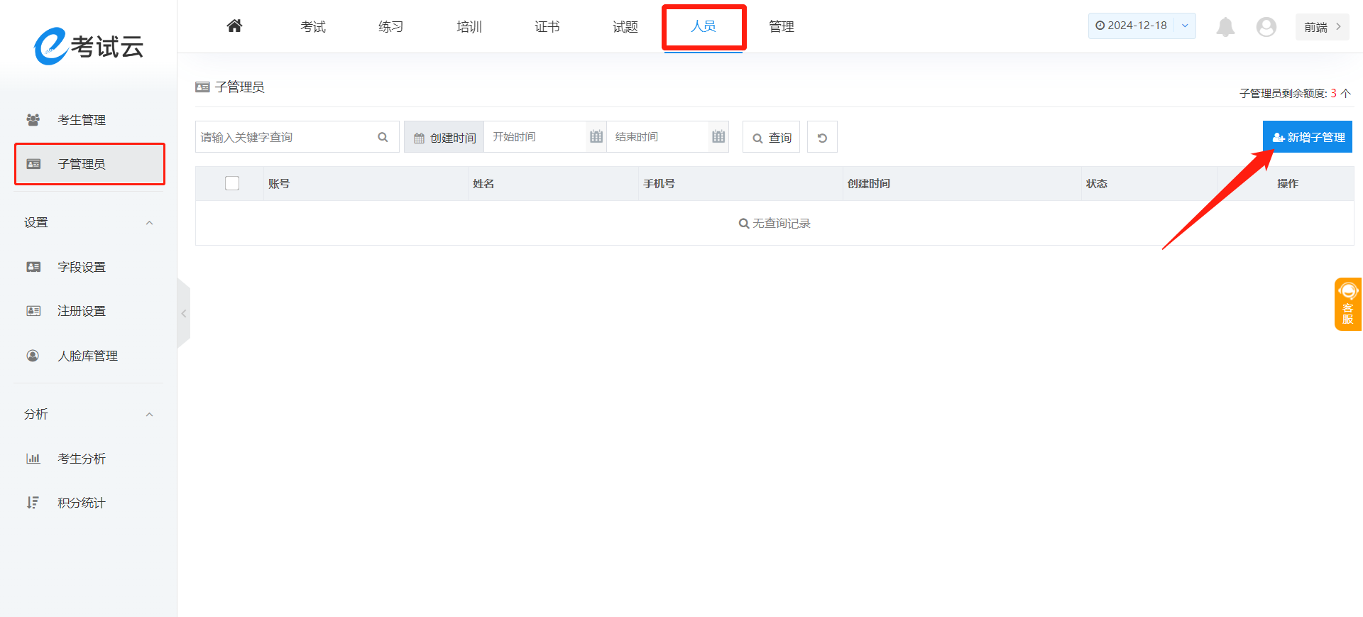 1、在顶部导航栏“人员”模块的左侧“子管理员”菜单中,点击“新增子管理”按钮;
