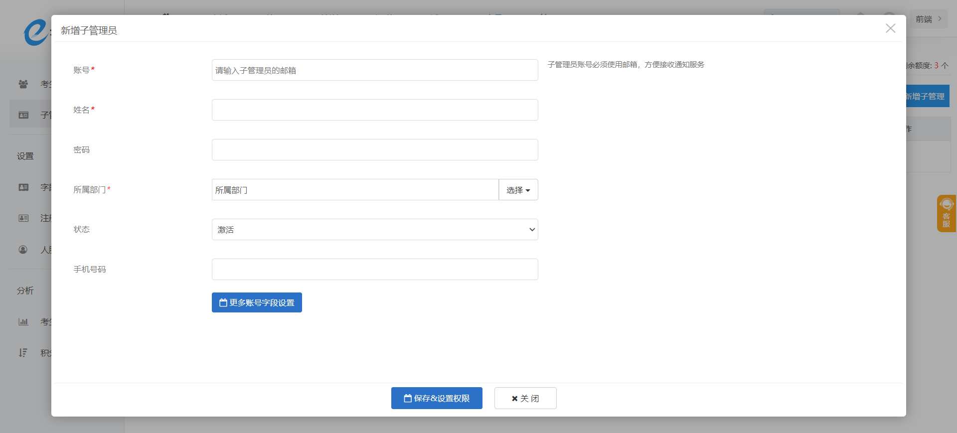 2、创建子管理员账号,填写好账号、姓名、密码、所属部门、手机号码等信息内容,点击“保存&设置权限”按钮;