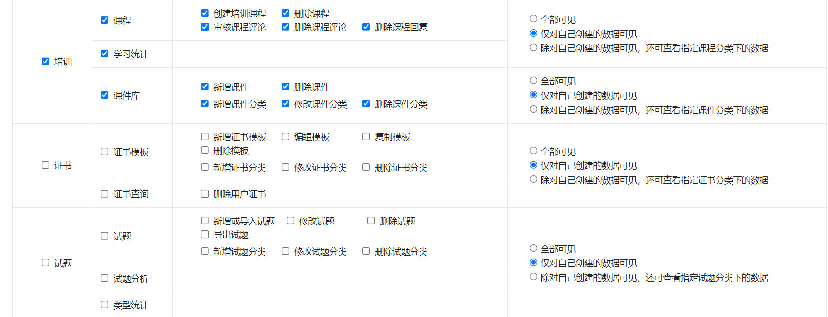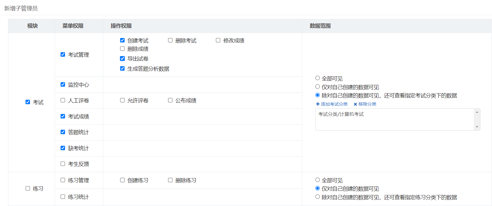 考试云从模块、菜单权限、操作权限及数据范围四个维度来控制子管理账号的功能操作权限:
